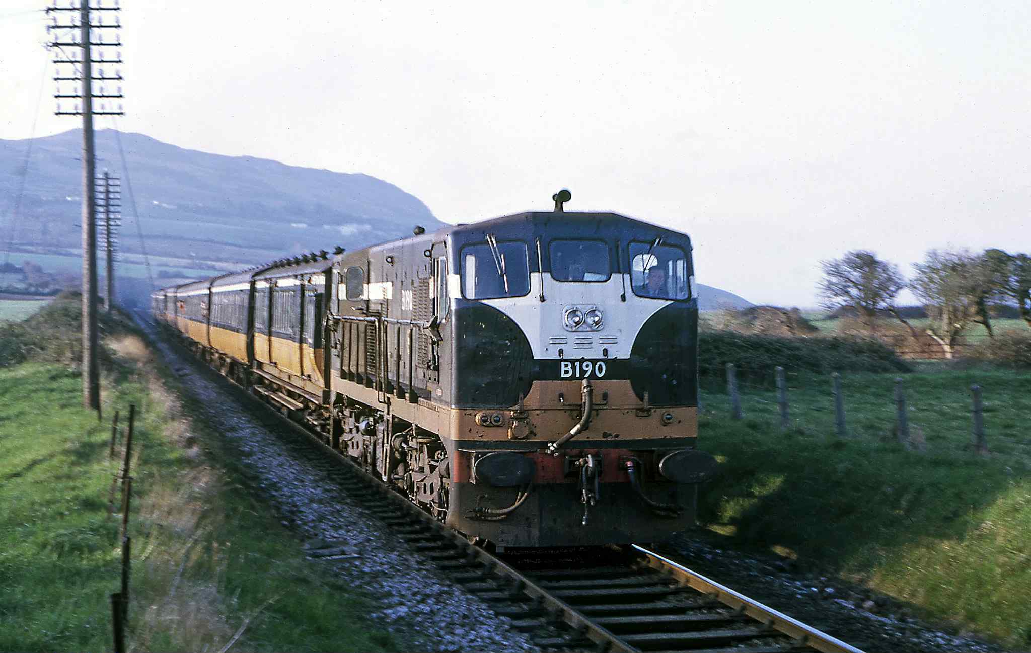 190 is one of several Downpatrick-based diesel locomotives owned by the Irish Traction Group (ITG). It was originally built for CIÉ in 1966 by General Motors at their plant in La Grange, Illinois, USA. Part of a batch of 12 locomotives, known as the (B)181 class, these were a follow on from the 1962 141 class, such as 146, and are very similar bar a few detail differences; as built, the 181 class had louvre vents on the cab fronts, though these were mostly removed over time. Another difference was the provision of external ladders on the bonnets, and a larger GM-